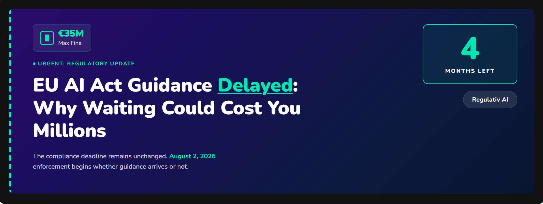 The EU AI Act is now enforceable, with fines up to €35M or 7% of global revenue. Organizations have 6-24 months to achieve compliance depending on their AI system risk classification.